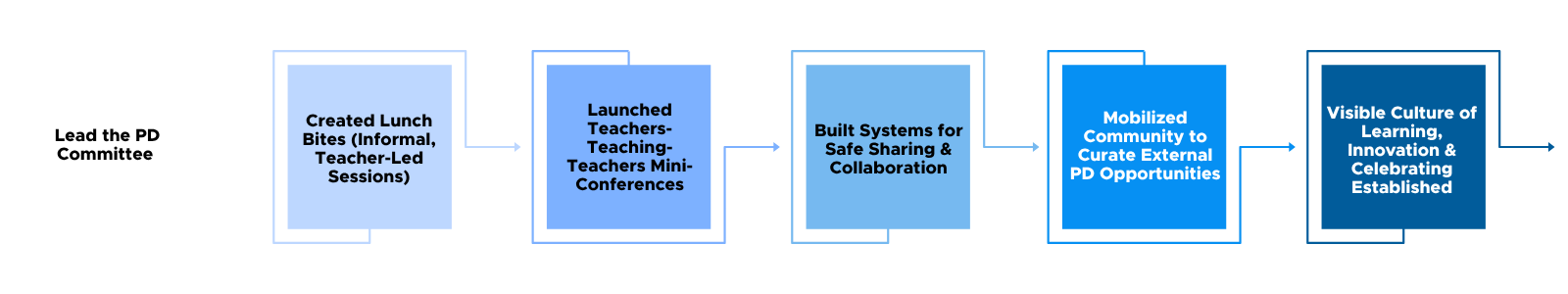 When I chaired the PD Committee, I wanted to shift the culture from "professional development is mandatory" to "professional learning is exciting." We created Lunch Bites—informal, teacher-led sessions where educators shared what worked in their classrooms. We launched teachers-teaching-teachers mini-conferences within the school, creating spaces for colleagues to showcase their expertise. I built systems that made sharing feel natural and safe, and mobilized the community to collect and share external PD opportunities so everyone could access them.